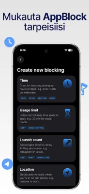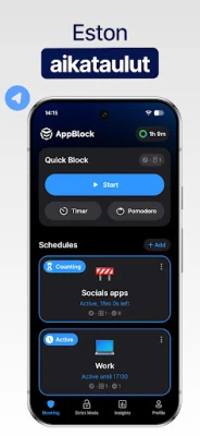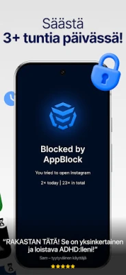 Kamppailetko jatkuvasti digitaalisten häiriötekijöiden kanssa? Hukkaantuuko arvokas aikasi loputtomaan selailuun tai tuottamattomiin sovelluksiin? AppBlock tarjoaa mullistavan ratkaisun digitaaliseen ylikuormitukseen. Se on älykäs apuri, joka auttaa sinua hallitsemaan ruutuaikaasi, vahvistamaan keskittymistä ja löytämään tasapainon hektisessä arjessa. AppBlockin avulla voit ottaa ohjat omasta ajastasi ja suunnata energiat siihen, mikä on todella tärkeää.