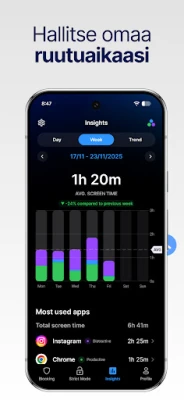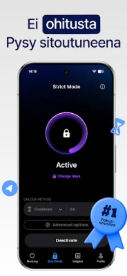 AppBlockin sydämessä on monipuolinen esto-ominaisuus, joka mahdollistaa häiritsevien sovellusten ja verkkosivustojen rajaamisen muutamalla eleellä. Voit helposti vaimentaa sosiaalisen median, pelit tai uutisvirrat, kun tarvitset syvää keskittymistä. Luo henkilökohtaisia profiileja työskentelyä, opiskelua tai rentoa vapaa-aikaa varten – jopa sijaintisi tai Wi-Fi-yhteyden perusteella. Kun asetat tarkkoja aikarajoja suosikkisovelluksillesi, AppBlock muistuttaa sinua lempeästi, kun on aika siirtyä eteenpäin. Tiukka tila varmistaa, etteivät impulsiiviset hetket pilaa tavoitteitasi, lukiten asetukset tehokkaasti paikoilleen.
