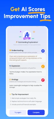 Kun olet esittänyt selityksesi, Feynman AI analysoi sen välittömästi ja tarjoaa kattavan raportin. Saat palautetta selkeydestä, tarkkuudesta, rakenteesta ja esimerkkien käytöstä, mikä auttaa sinua tunnistamaan heikkoudet ja tarkentamaan ymmärrystäsi rivi riviltä. Tekoälyvalmentajasi antaa konkreettisia parannusehdotuksia, ohjaten sinua hiomaan ajatteluasi ja viestintääsi. Olipa kyse sitten matematiikasta, fysiikasta, kemiasta, biologiasta, historiasta tai liiketoiminnan käsitteistä, Feynman AI on suunniteltu syventämään tietämystäsi monipuolisesti.