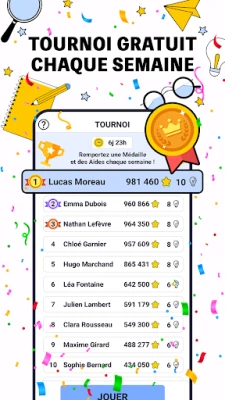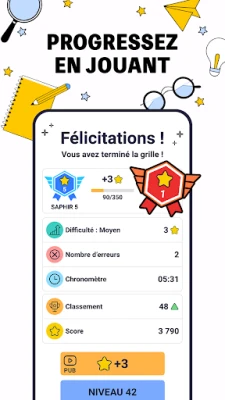 Edisty pelatessasi ansaitsemalla tähtiä ja keräämällä uusia merkkejä Pronssista Legendaan – jokainen saavutettu taso palkitsee sinut ainutlaatuisella merkillä. Jos juutut vaikeaan pulmaan, käytä apua paljastaaksesi kirjaimen ja jatkaaksesi eteenpäin. Muista kirjautua päivittäin kerätäksesi jatkuvasti parempia palkintoja ja aktivoidaksesi ainutlaatuisen bonuksen, joka odottaa sinua viidennestä päivästä alkaen ja nopeuttaa edistymistäsi. Mots Fléchés Pro: Mots Croisés toimii myös ilman Wi-Fi-yhteyttä, joten voit nauttia sanapulmista missä ja milloin tahansa. Verkkoon yhdistettynä saat käyttöösi edistyksellisiä toimintoja, jotka tekevät pelikokemuksesta entistäkin syvällisemmän.