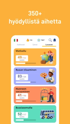 FunEasyLearnin ainutlaatuinen oppimismenetelmä on kielitieteilijöiden ja opettajien tiimin vuosien työn tulos. Se yhdistää saumattomasti visuaalisen oppimisen, alkuperäisäänteiden kuuntelun ja interaktiiviset harjoitukset, varmistaen syvällisen ymmärryksen. Käytössäsi on yli 6 000 jatkuvasti laajenevaa italian sanaa, jotka on järjestetty selkeästi aihealueittain ja tasoittain, aloittelijasta edistyneeseen. Lisäksi 5 000 usein käytettyä lausetta kattaa kaiken päivittäisestä kommunikaatiosta erityistilanteisiin, auttaen sinua puhumaan luontevasti ja itsevarmasti.