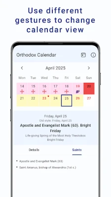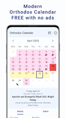 Orthodox Calendar tuo käyttöösi useita hyödyllisiä toimintoja. Kuukausinäkymä antaa selkeän yleiskuvan kaikista paastoista ja juhlapyhistä, kun taas yksityiskohtaiset päiväkohtaiset tiedot tarjoavat syvempää ymmärrystä kunkin päivän merkityksestä. Voit mukauttaa kalenterin juuri omiin tarpeisiisi valitsemalla Julianisen tai Uudistetun Julianisen kalenterityypin ja hallitsemalla paaston poikkeustietojen näyttämistä. Palveluviestit pitävät sinut ajan tasalla uusimmista päivityksistä ja ominaisuuksista, ja monipuoliset kielivaihtoehdot, kuten englanti, venäjä ja ukraina, varmistavat käyttömukavuuden eri puolilla maailmaa. Myös useita muita kieliä on jo varhaisessa vaiheessa saatavilla.