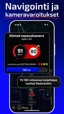Radarbot toimii saumattomasti kaikkialla maailmassa ja on suunniteltu yhteensopivaksi muiden sovellusten kanssa – voit käyttää sitä samanaikaisesti GPS-navigaattorin tai musiikkisovelluksesi rinnalla. Saat ilmoitukset luotettavasti myös taustalla tai näytön ollessa sammutettuna, ja ne ovat aina suunnattu vain omaan ajosuuntaasi. Äänihälytykset ja värinätila motoristeille varmistavat, että pysyt tietoisena. Yli 50 miljoonan käyttäjän aktiivinen yhteisö jakaa reaaliaikaisia hälytyksiä odottamattomista tapahtumista, kuten ruuhkista, onnettomuuksista, mobiilipoliiseista ja muista vaaroista, antaen sinulle mahdollisuuden ennakoida ja välttää niitä. Iteration Mobilen asiantuntijatiimi päivittää Radarbotin maailmanlaajuista tutkatietokantaa päivittäin, mikä takaa sen tarkkuuden ja ajantasaisuuden.
